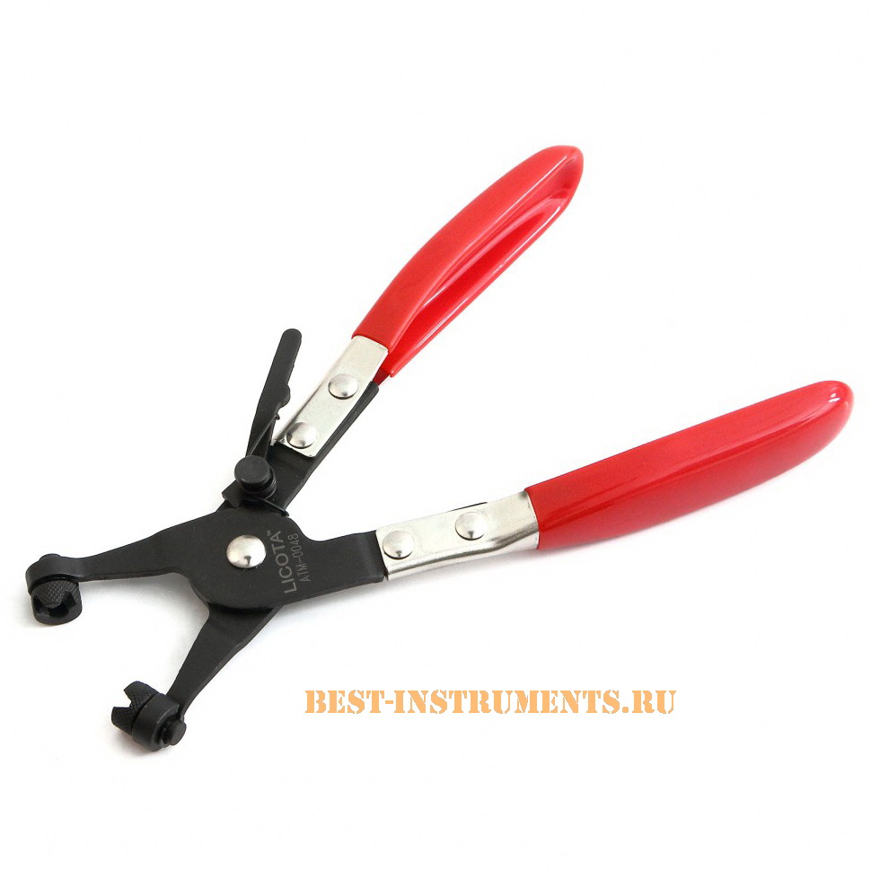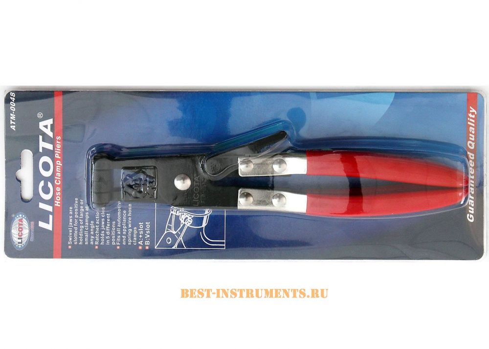 ATM-0048 Клещи для хомутов шлангов, губки с "v" разъёмом Licota предназначены для работы с многоразовыми самозажимными пружинными хомутами топливных, масляных и водяных шлангов. Поворотные губки обеспечивают доступ к труднодоступным хомутам. Трещоточный механизм с 5-ю положениями позволяет зафиксировать хомут в разжатом состоянии. Губки клещей имеют прорези формы "V".